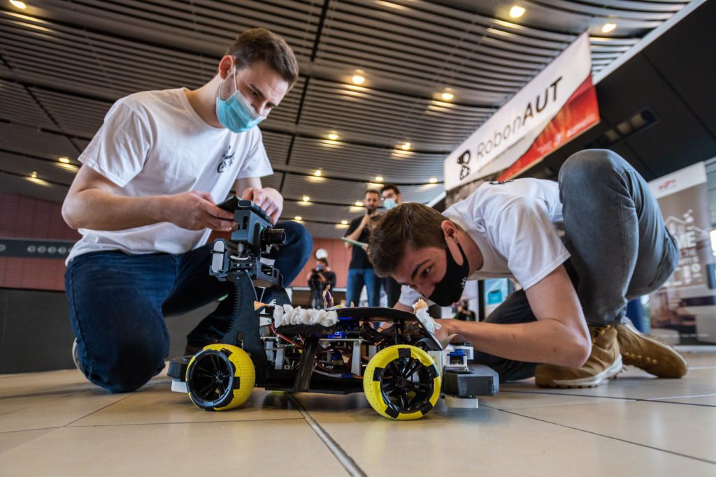 Robotautót szerelnek résztvevők a RobonAUT 2022 versenyen a Budapesti Műszaki és Gazdaságtudományi Egyetemen 2022. február 12-én. Az autóknak emberi beavatkozás nélkül kell végighaladniuk egy gyorsasági és egy akadálypályán.