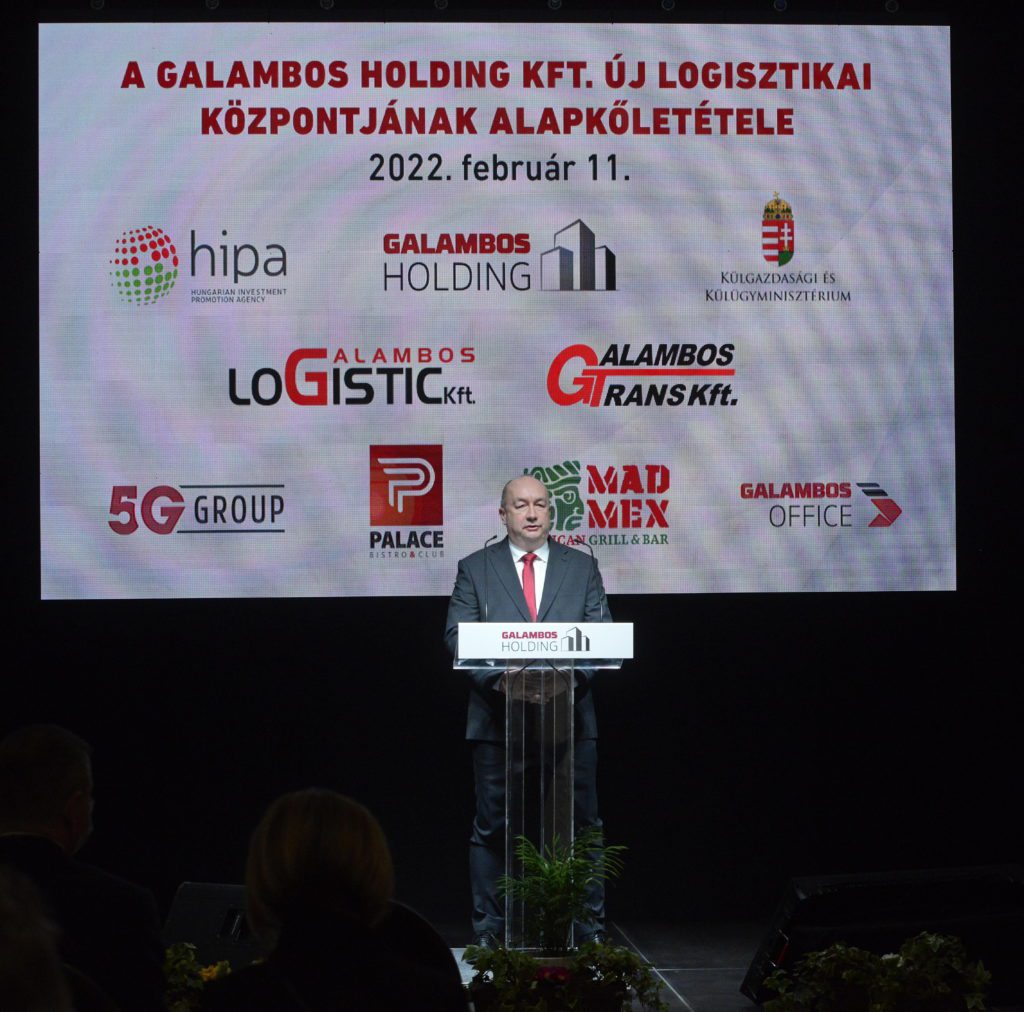 Galambos Tamás, a Galambos Logistic Kft. ügyvezetője beszédet mond a Galambos Logistic Kft. új központjának ünnepélyes alapkőletételén Szombathelyen 2022. február 11-én. A szállítmányozással foglalkozó, családi tulajdonban lévő kft. 5,6 milliárd forintos beruházását az állam 1,9 milliárd forinttal támogatja, így hozzájárulva 56 új munkahely létrehozásához. Szijjártó Péter közölte, hogy a hazai tulajdonú vállalkozások megerősödése nélkül nem tudta volna a magyar gazdaság tavaly megdönteni a foglalkoztatottság, a beruházások és az exportteljesítmény rekordját.