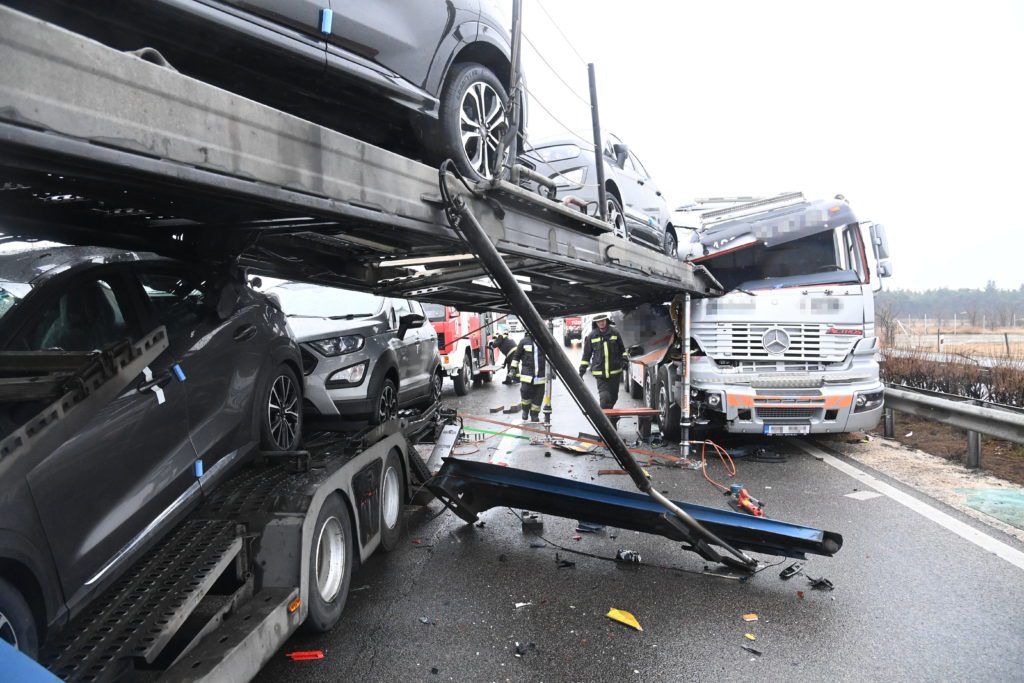 Inárcs, 2022. március 31. Tűzoltók az M5-ös autópálya Budapest felé vezető oldalán, Inárcs közelében, ahol összeütközött két kamion 2022. március 31-én. A balesetben egy ember megsérült.