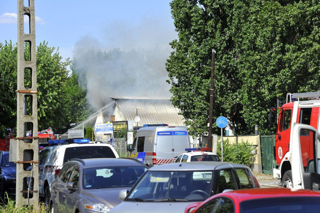 Füst gomolyog Budapest XIII. kerületében, a Tatai utcában 2022. július 4-én, ahol mintegy ezer négyzetméteren ég egy földszintes raktárépület tetőszerkezete. A tűzoltók több gázpalackot kivittek az épületből és négy vízsugárral oltják a lángokat.