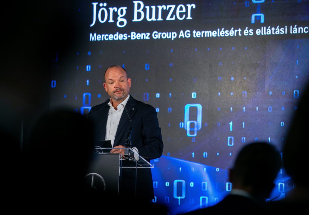 Jörg Burzer, a Mercedes-Benz Group AG termelését és ellátási láncért felelõs igazgatósági tagja beszédet mond a Mercedes-Benz Manufacturing Hungary Kft. beruházásbejelentõ sajtótájékoztatóján Kecskeméten 2022. július 21-én. Az idei év eddig bejelentett legnagyobb beruházása keretében a Mercedes 400 milliárd forint értékben új gyártósorokkal bõvíti magyarországi összeszerelõ és karosszéria üzemét.