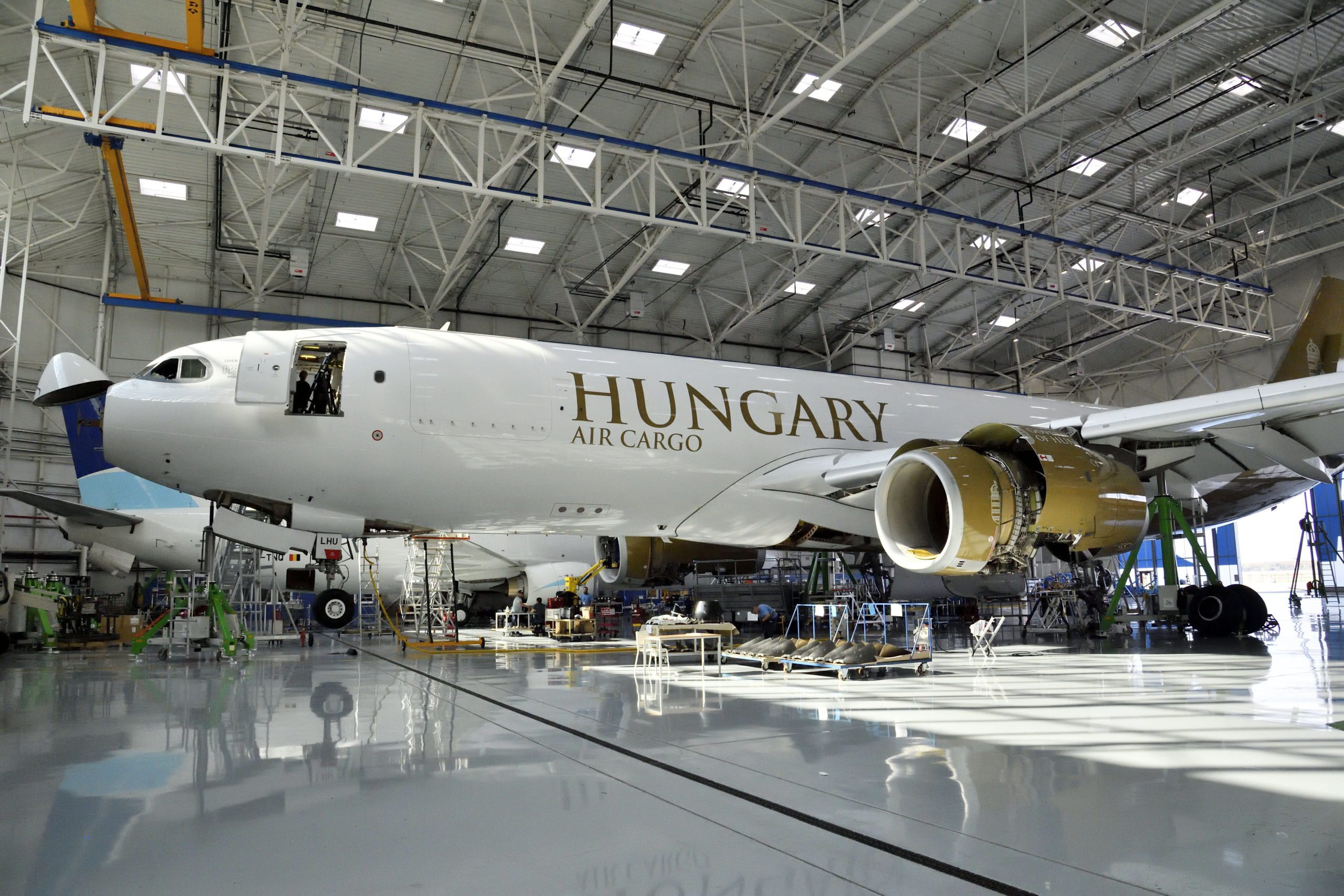 Az időszakos nagykarbantartásra érkezett első szélestörzsű, Airbus A330F típusú teherszállító repülőgép az Aeroplex Közép-Európai Kft. új hangárjában, a Liszt Ferenc-repülőtéren 2022. szeptember 5-én. A teljeskörű karbantartást magyar szakemberek végzik a cég idén márciusban átadott új hangárjában.