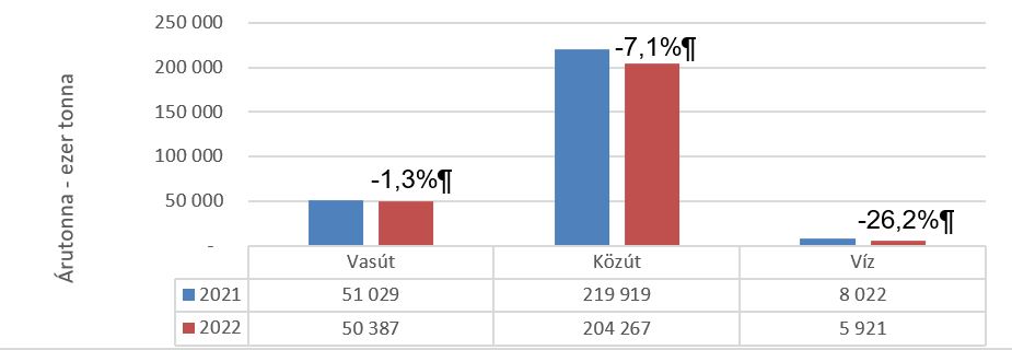 Nem volt jó éve a hazai árufuvarozásnak tavaly, a nemzetközi gazdasági nehézségek, az ener-giaárak megugrása, az infláció, az orosz-ukrán háború, valamint az aszály okozta terméskiesés miatt visszaesett az áruszállítás Magyarországon. A közúti, vasúti és vízi áruforgalom volumene (261 millió tonna) 6 százalékkal, teljesítménye (50,2 milliárd tonnakilométer) 0,5 százalékkal csökkent tavaly 2021-hez képest az előzetes statisztikai adatok szerint.