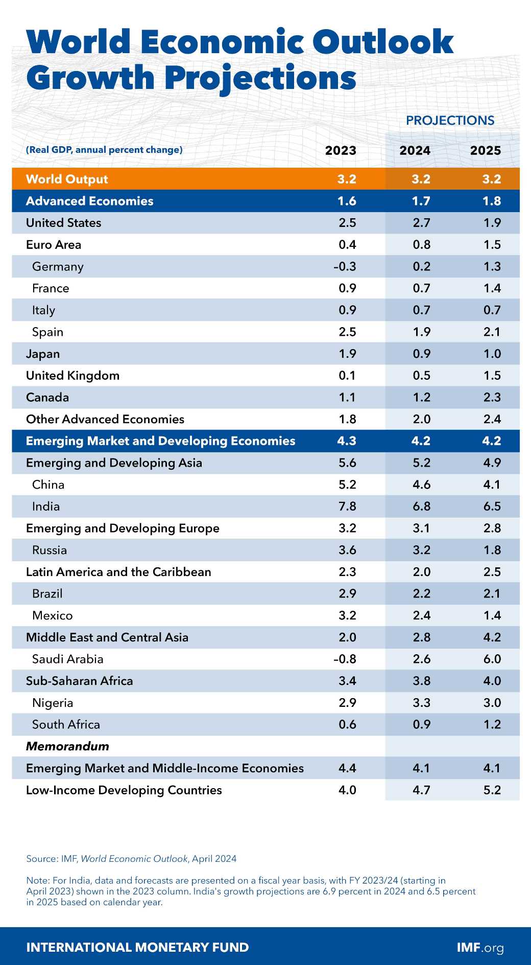 A Nemzetközi Valutaalap (IMF) április 16-án közzétette a világgazdaság helyzetést és várható jövőjét bemutató féléves jelentését. A World Economic Outlook szerzői szerint a globális növekedés szintje 2024-ben is az előző évben mért 3,2% körül alakul, és ez várhatóan 2025-ben sem változik majd.