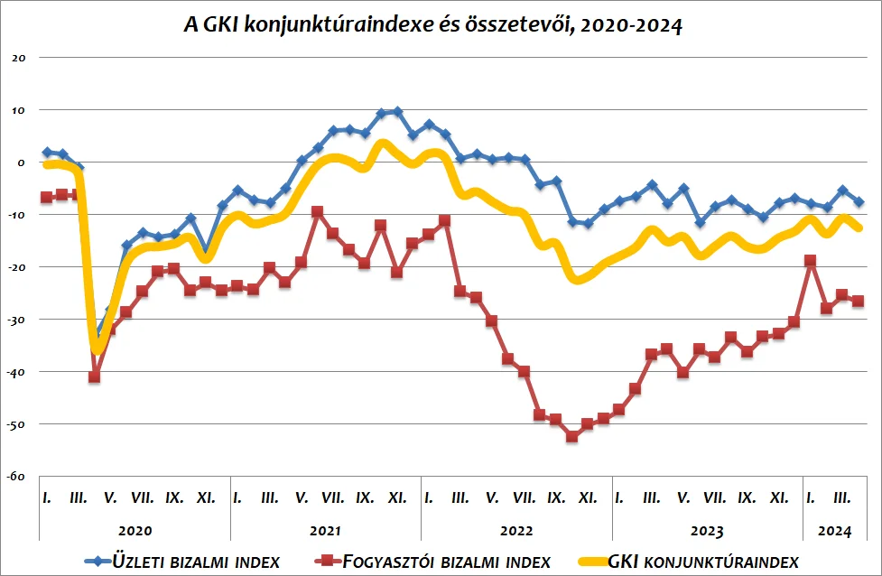 Áprilisiban 2 ponttal csökkent GKI Gazdaságkutató konjuktúraindexének értéke. Az EU támogatásával készült kutatás szerint ebben a hónapban az üzleti világ és a lakosság is valamelyest kedvezőtlenebbül látta saját helyzetét és jövőjét.