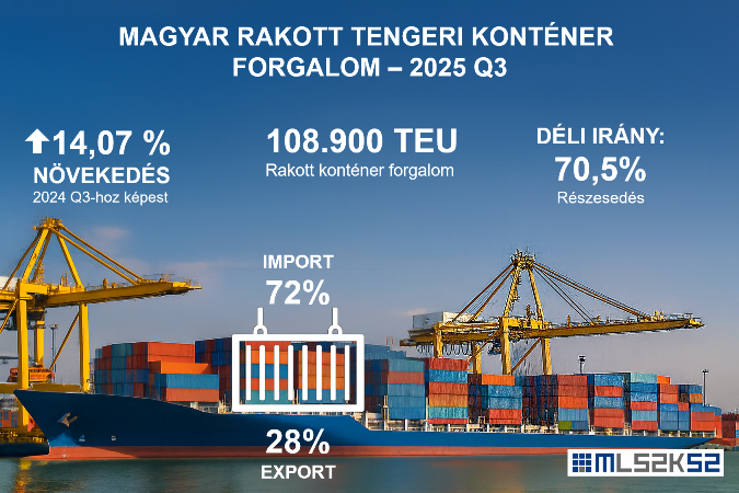 A Magyarországi Logisztikai Szolgáltató Központok Szövetsége (MLSZKSZ) adatai szerint a magyar tengeri rakott konténeres intermodális piac 2025 harmadik negyedévében 108 900 TEU rakott forgalmat ért el, ami több mint 12 000 TEU-val haladja meg az egy évvel korábbit. Az import aránya 72 százalék, az exporté 28 százalék volt, a déli irány továbbra is meghatározó, 70,5 százalékos részesedéssel.